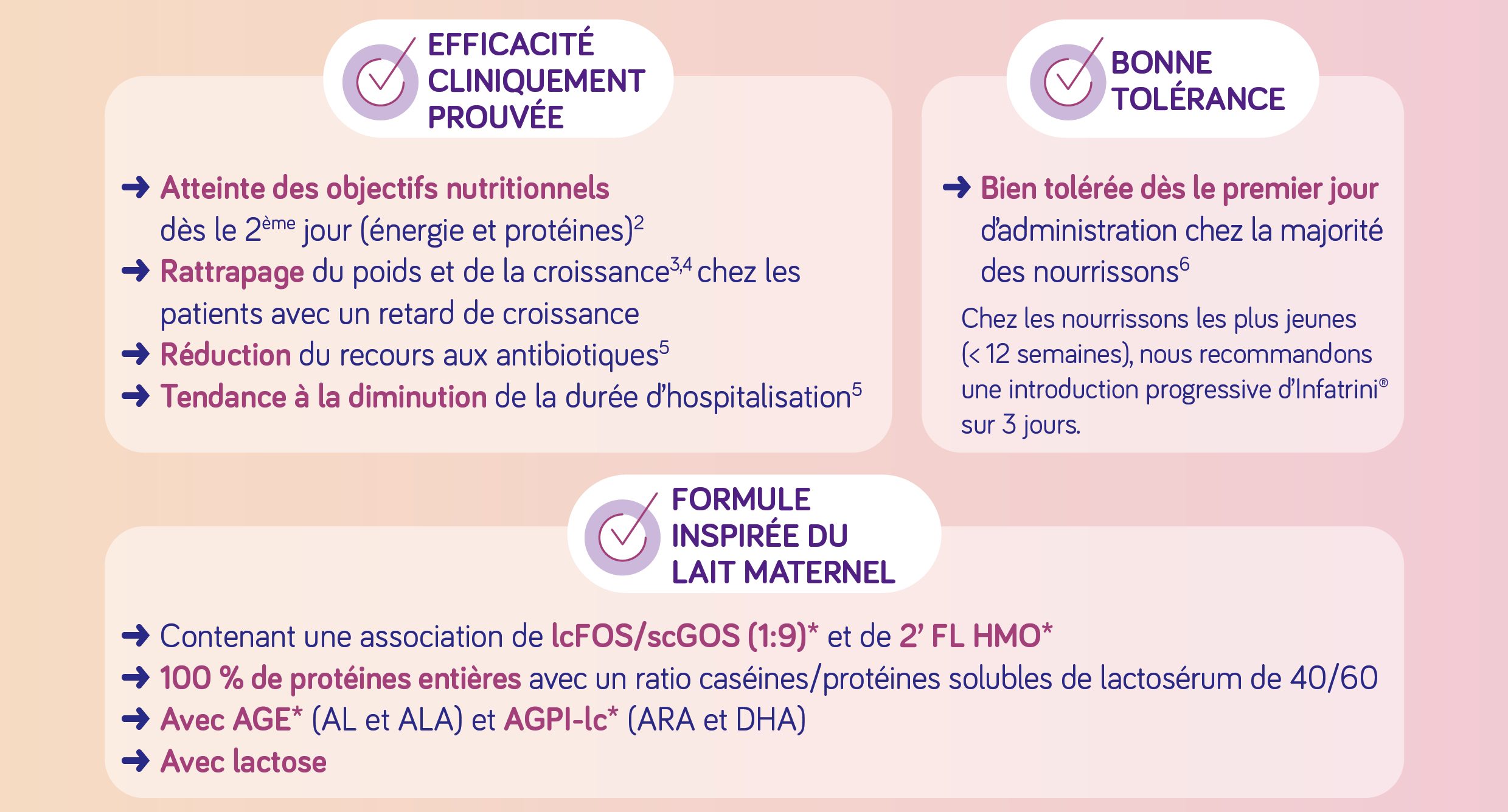 Les produits Infatrini® sont des denrées alimentaires destinées à des fins médicales spéciales pour les besoins nutritionnels des nourrissons en cas de dénutrition, risque de dénutrition ou retard de croissance, à utiliser sous contrôle médical après avoir envisagé toutes les options possibles notamment l’allaitement maternel. Ils peuvent être utilisés en complément ou comme seule source d’alimentation.