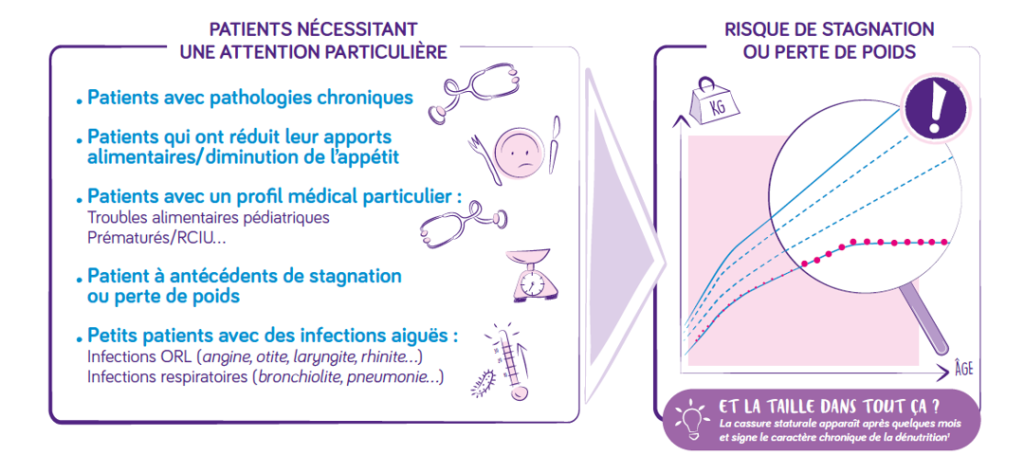 – de l’enfant de moins de 12 mois, dénutri ou ayant un risque significatif de dénutrition en raison d’apports spontanés insuffisants par rapport aux besoins estimés ou mesurés ou d’hypermétabolisme et/ou d’hypercatabolisme associé à un syndrome de malabsorption.