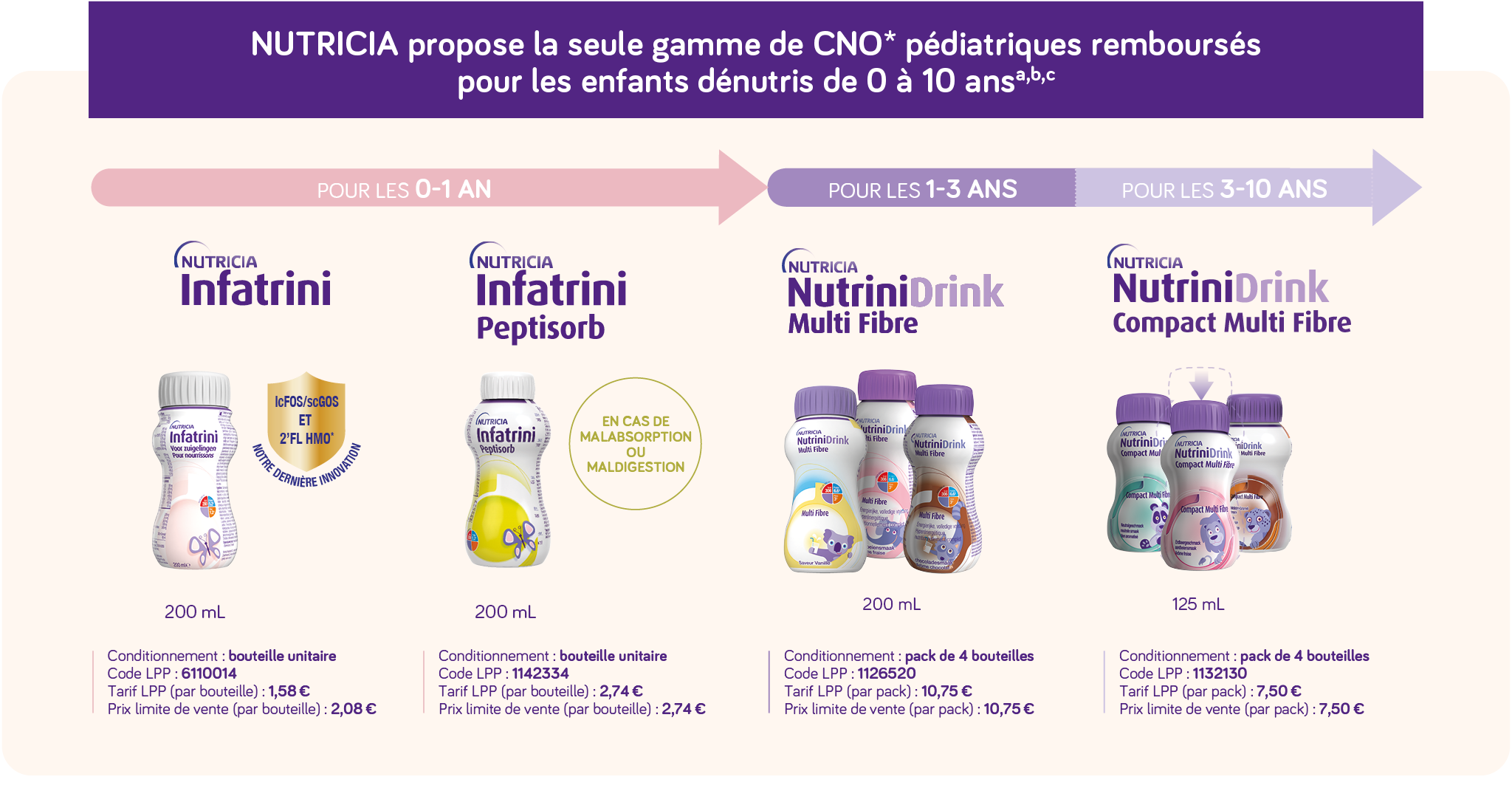 a. Infatrini® : Indication de prise en charge pour Infatrini® 200 mL et 500 mL : Arrêté du 23 février 2010 – JO du 2 mars 2010. Prise en charge en cas de dénutrition selon les critères : rapport poids/ taille < 90 % ou rapport taille/âge < 95 % ou risque significatif de dénutrition. Avis relatif à la baisse du prix du prix pour Infatrini® 200 mL : JO du 21 octobre 2016.